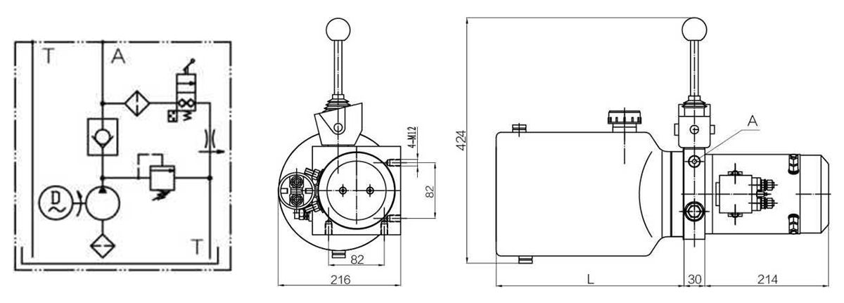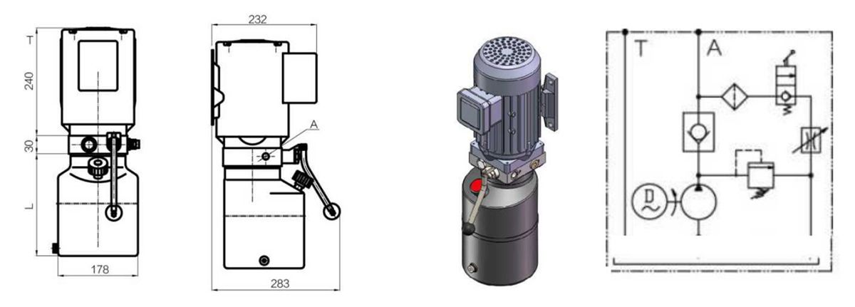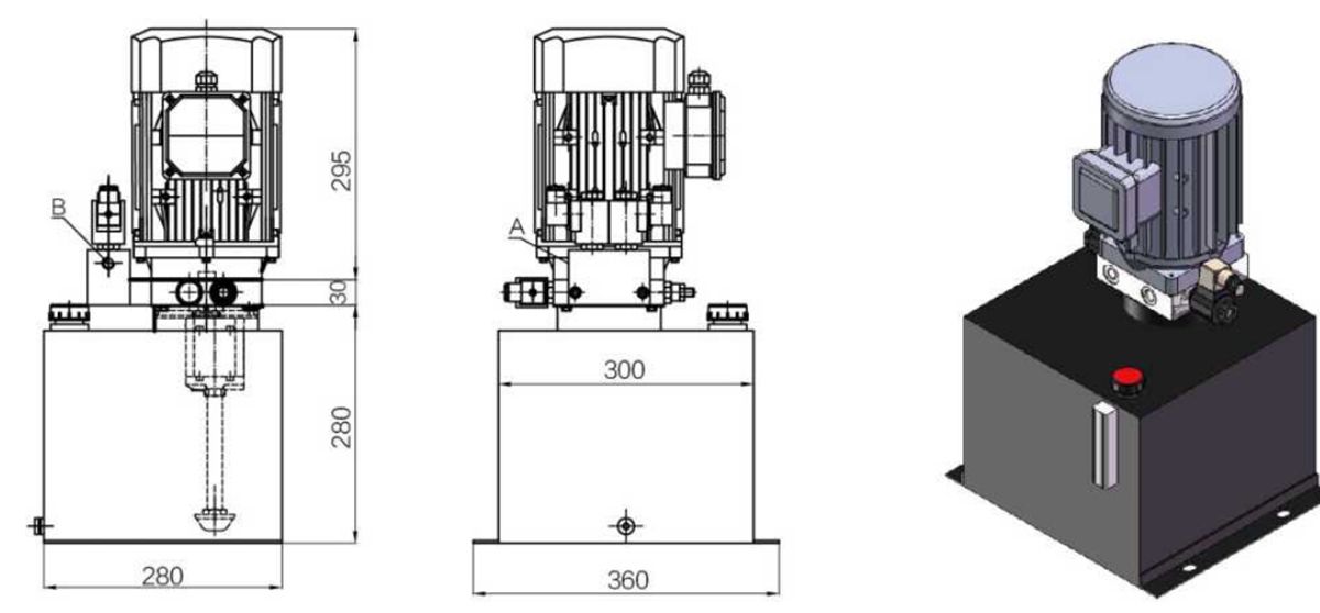 | Modelo | Motor | Deslocamento pela bomba | Capacidade do tanque | Pressão | Método de montagem | Entrada de combustível | L(mm) |