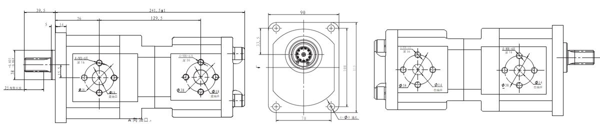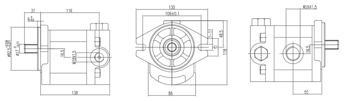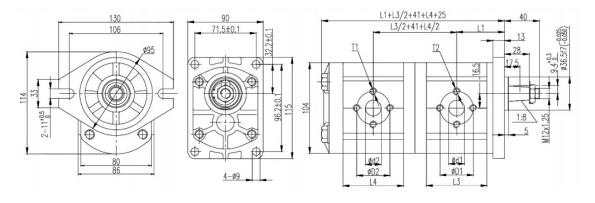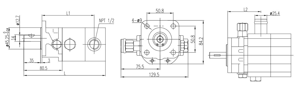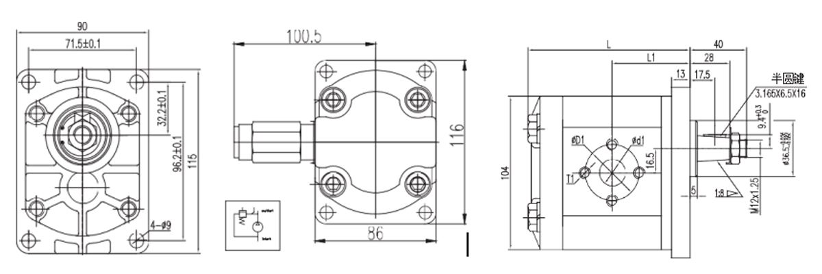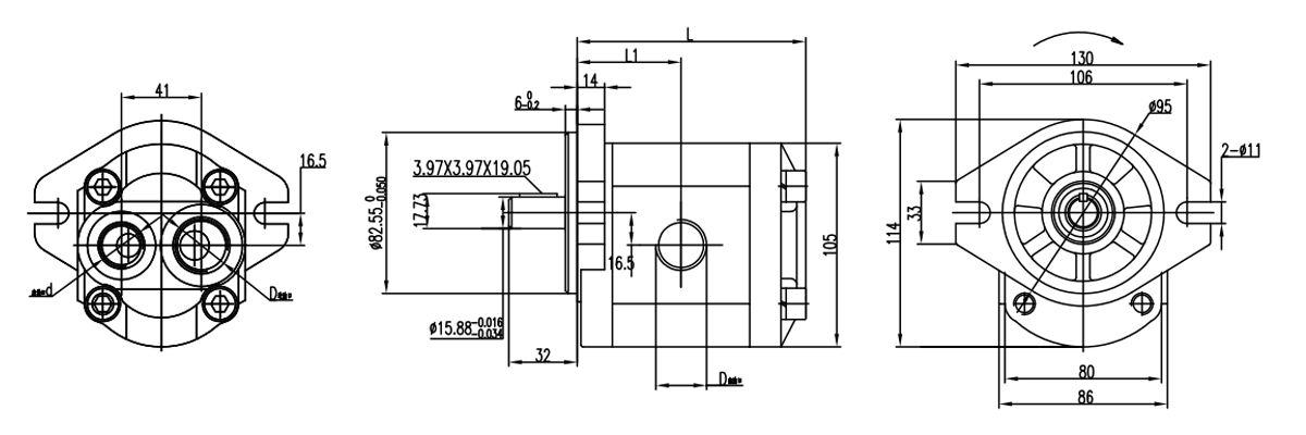 | Modelo | Deslocamento (ml/r) | Pressão (bar) | Velocidade (r/min) | L | L1 | Porta de entrada | Porta de saída | |||||||