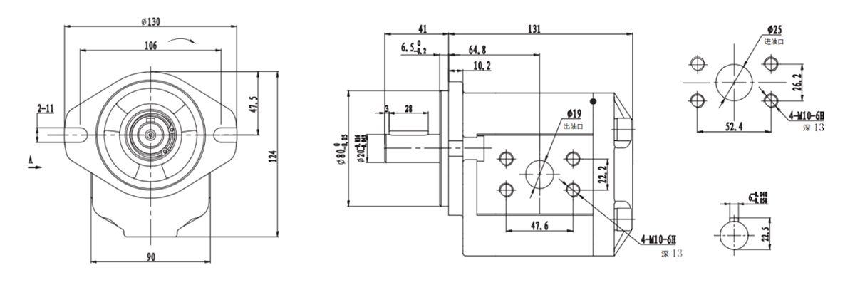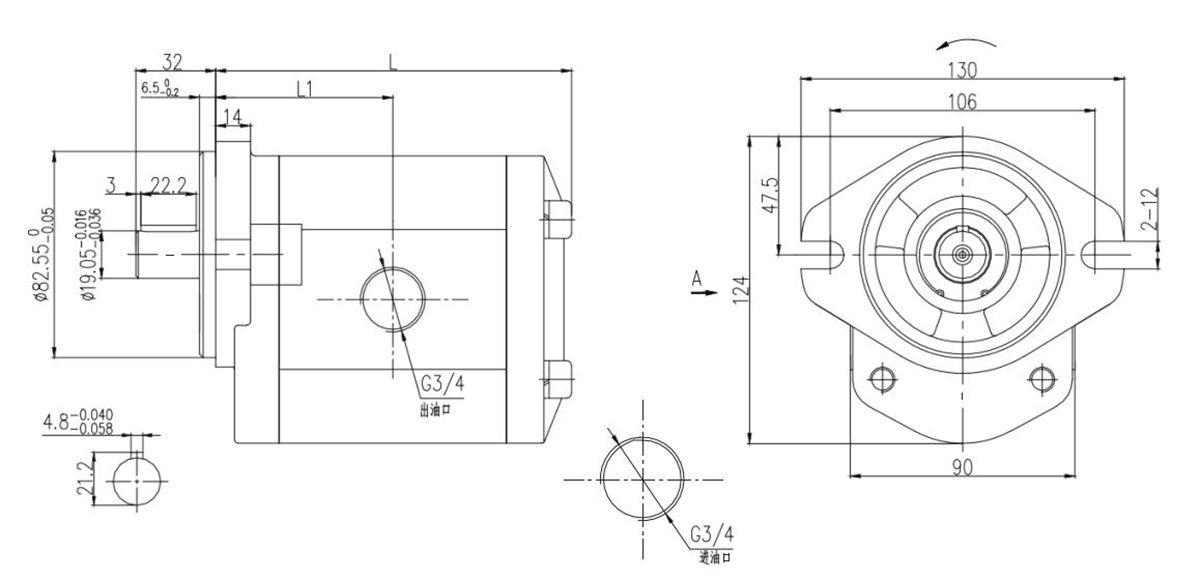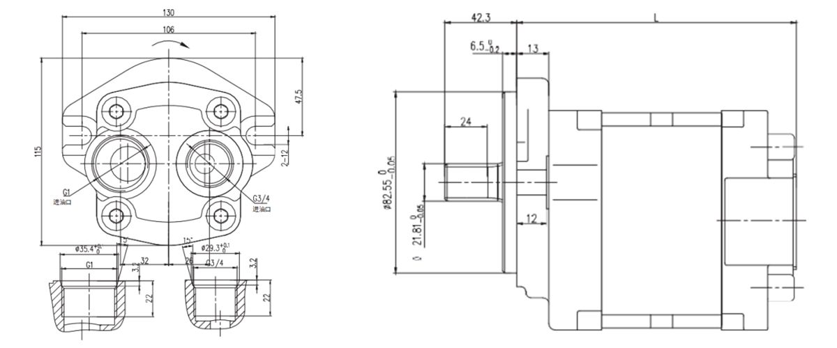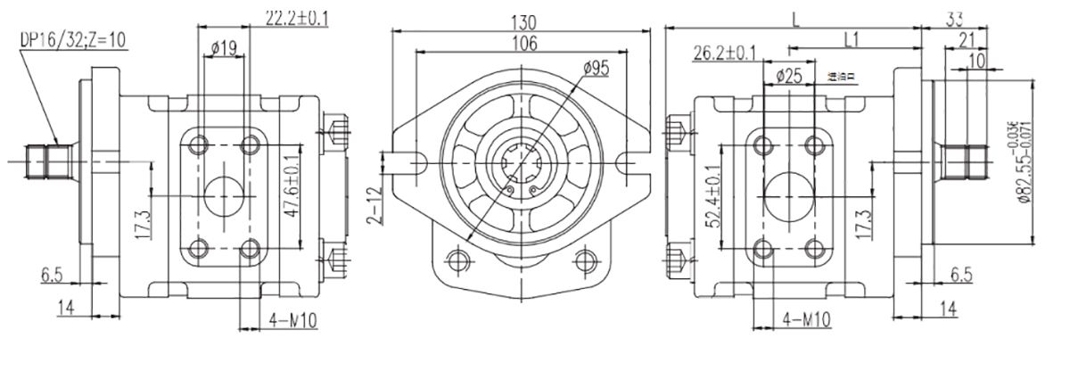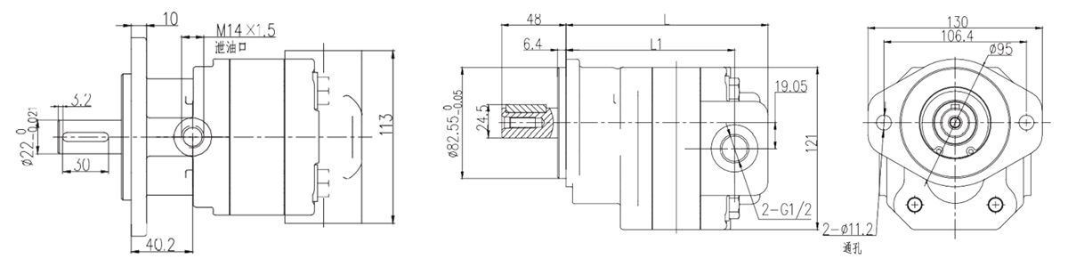 | Modelo | Deslocamento (ml/r) | Pressão (bar) | Velocidade (r/min) | L(mm) | L1(mm) | Porta de entrada | Porta de saída | |||