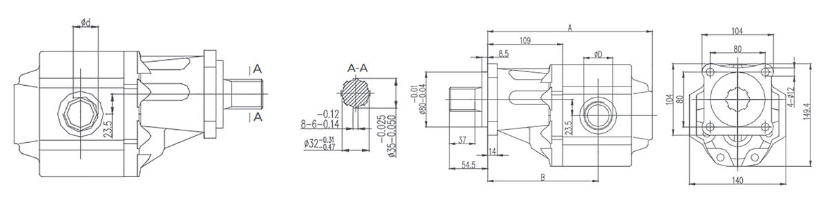 | Modelo | Deslocamento (ml/r) | Pressão (bar) | Velocidade (r/min) | A | B | D | d (mm) | |||